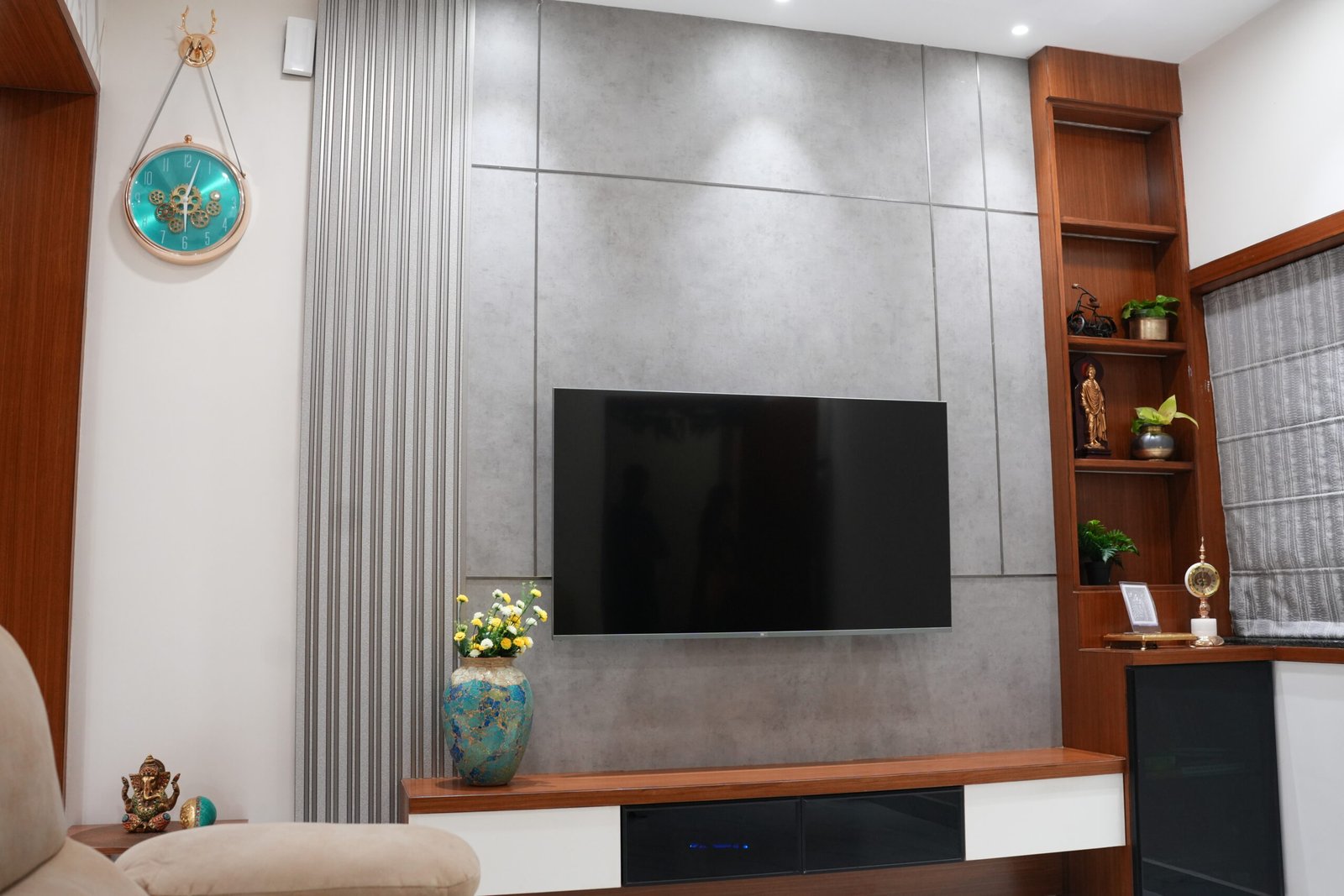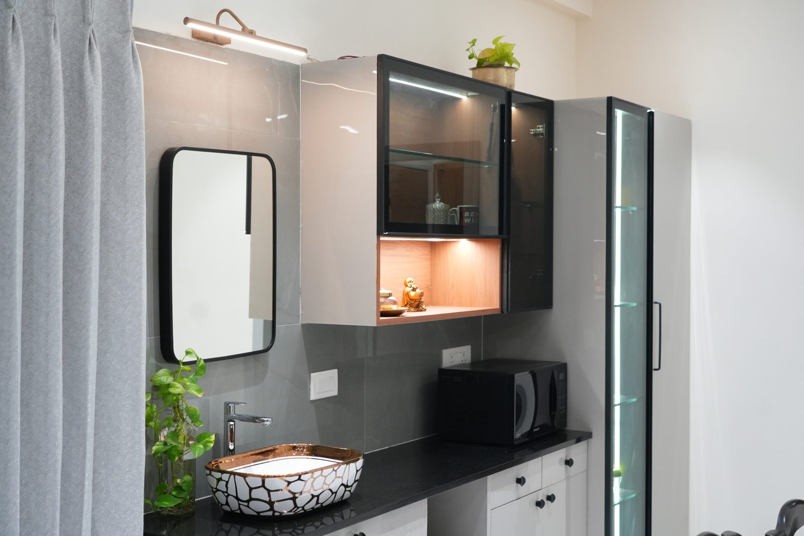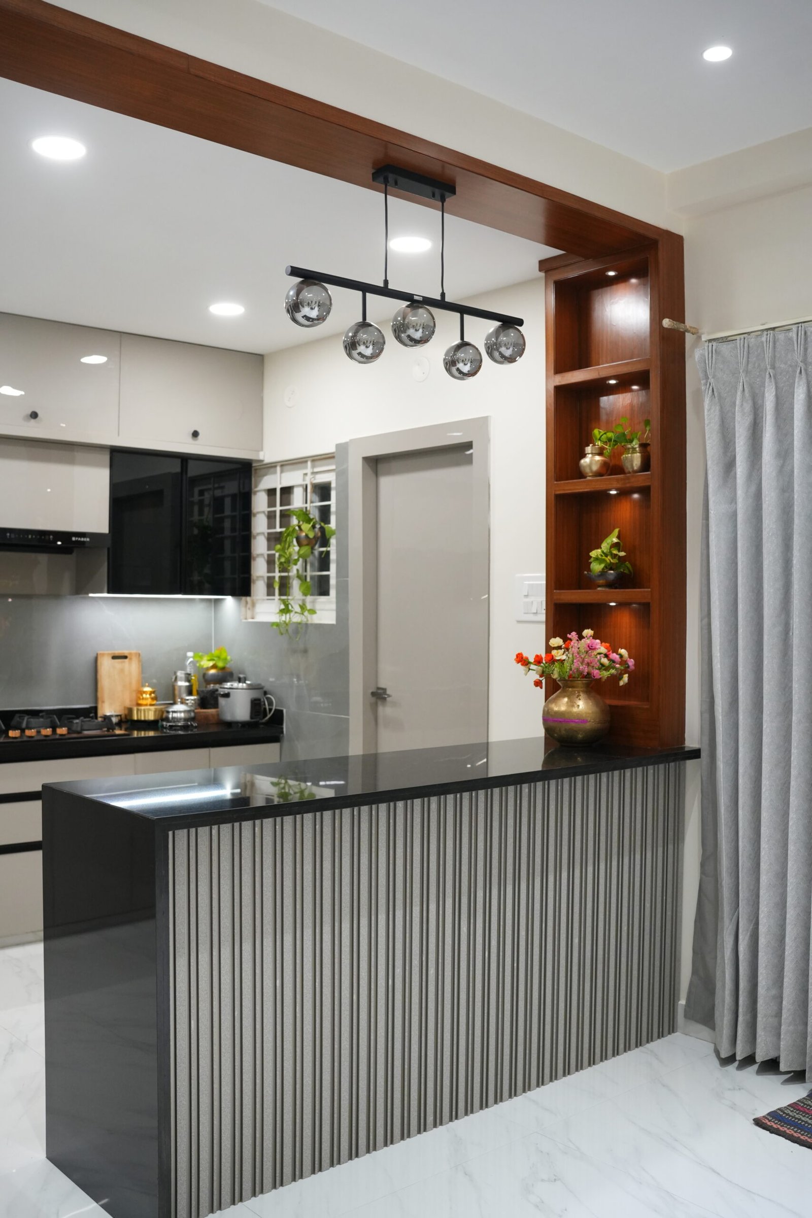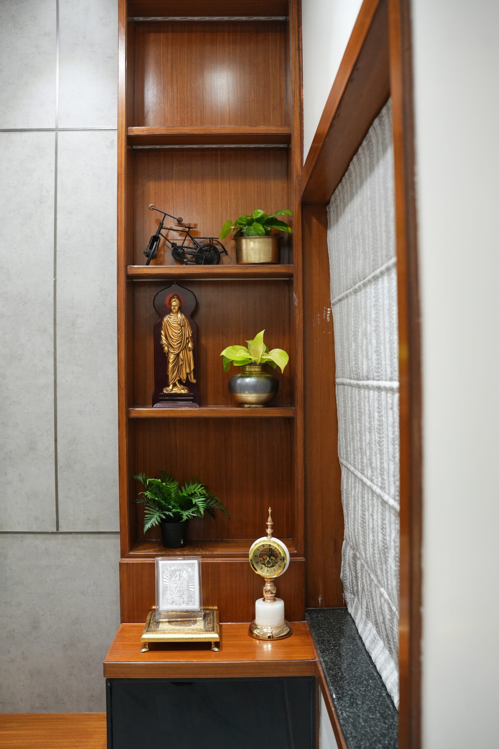 A seamless fusion of contemporary design and cultural reverence, where every corner balances style, storage, and spiritual serenity.
