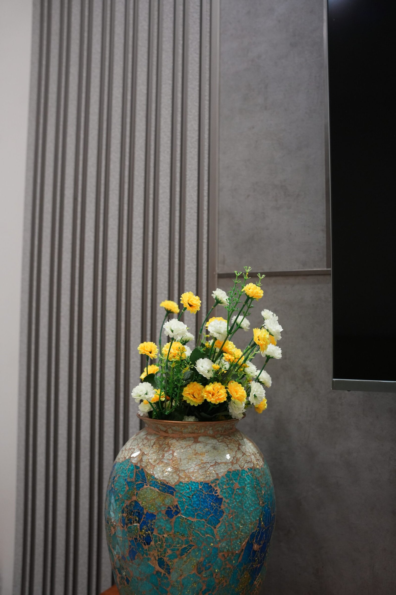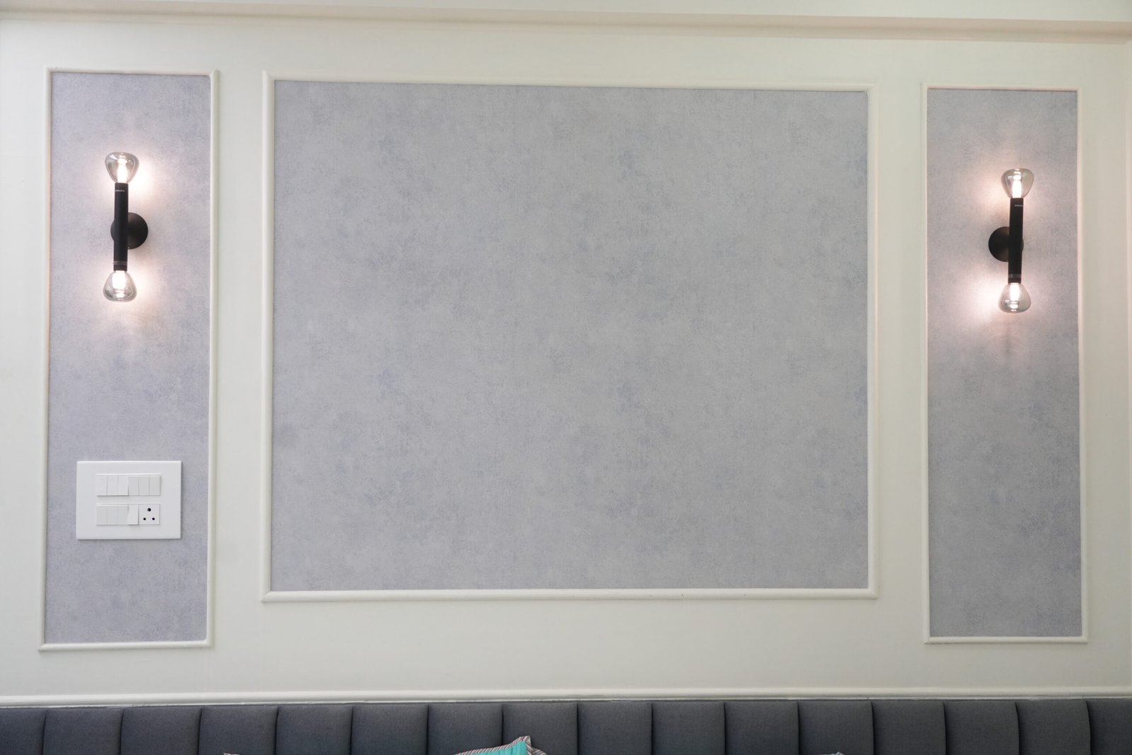 • Grey concrete-effect panels with white and beige tones
