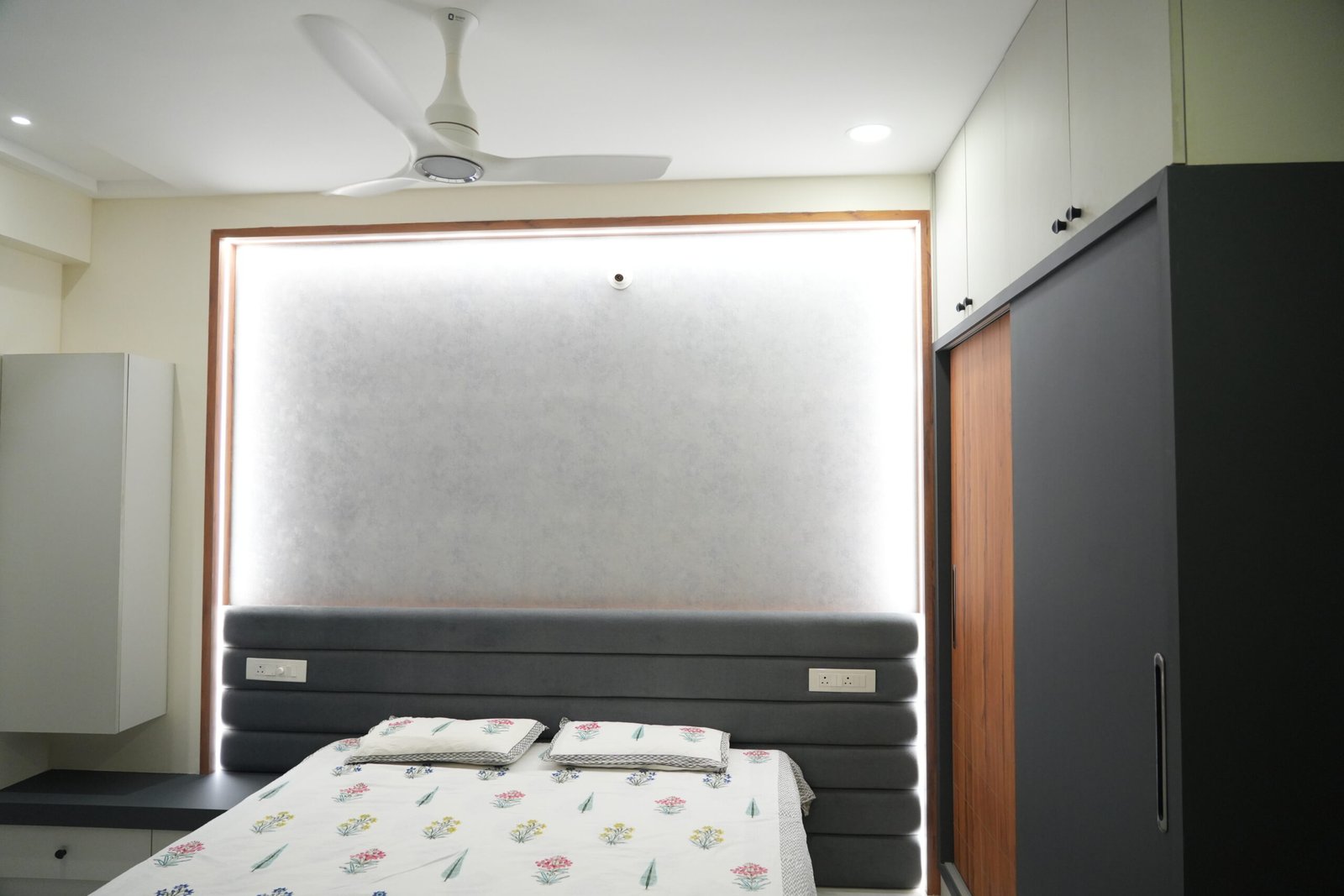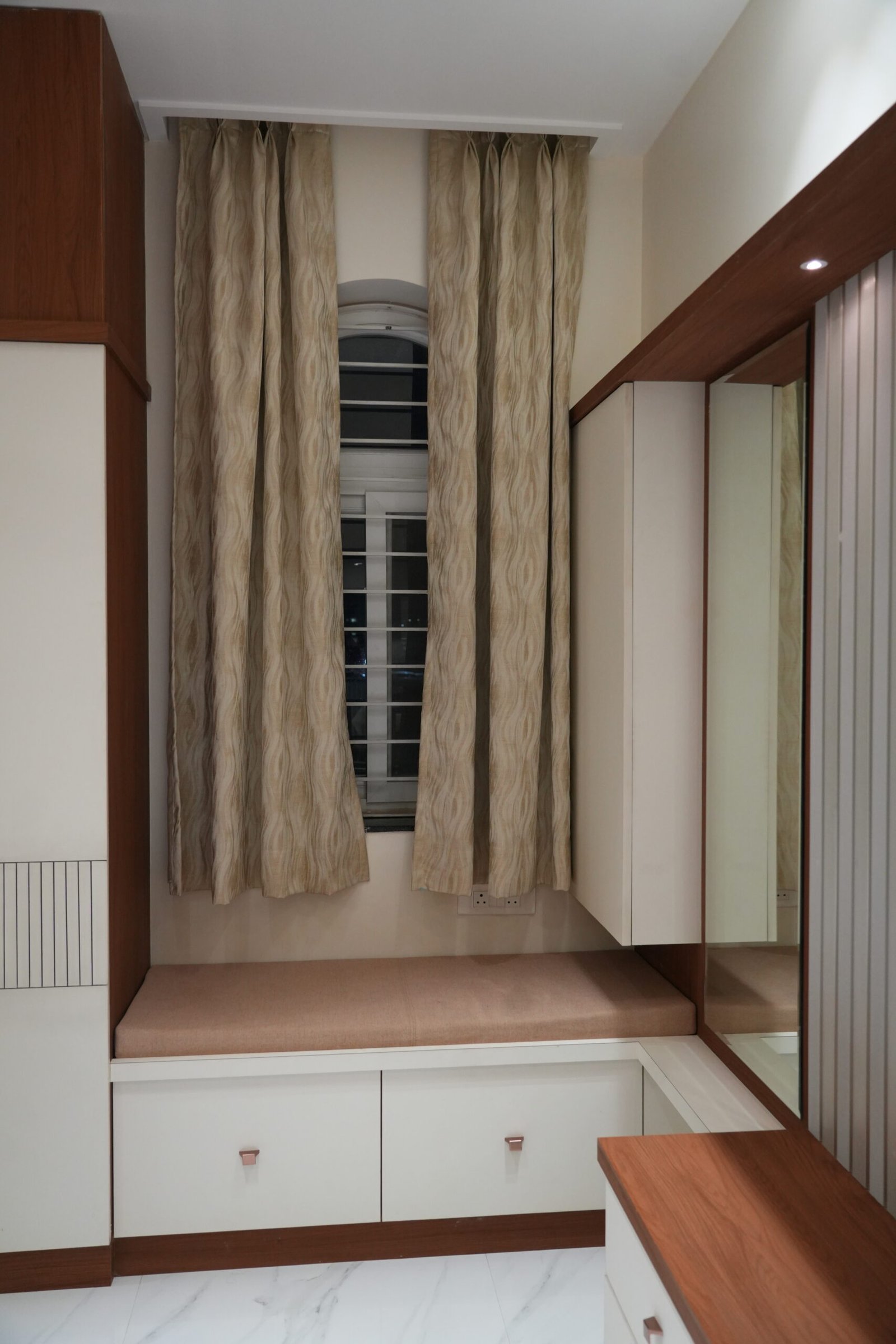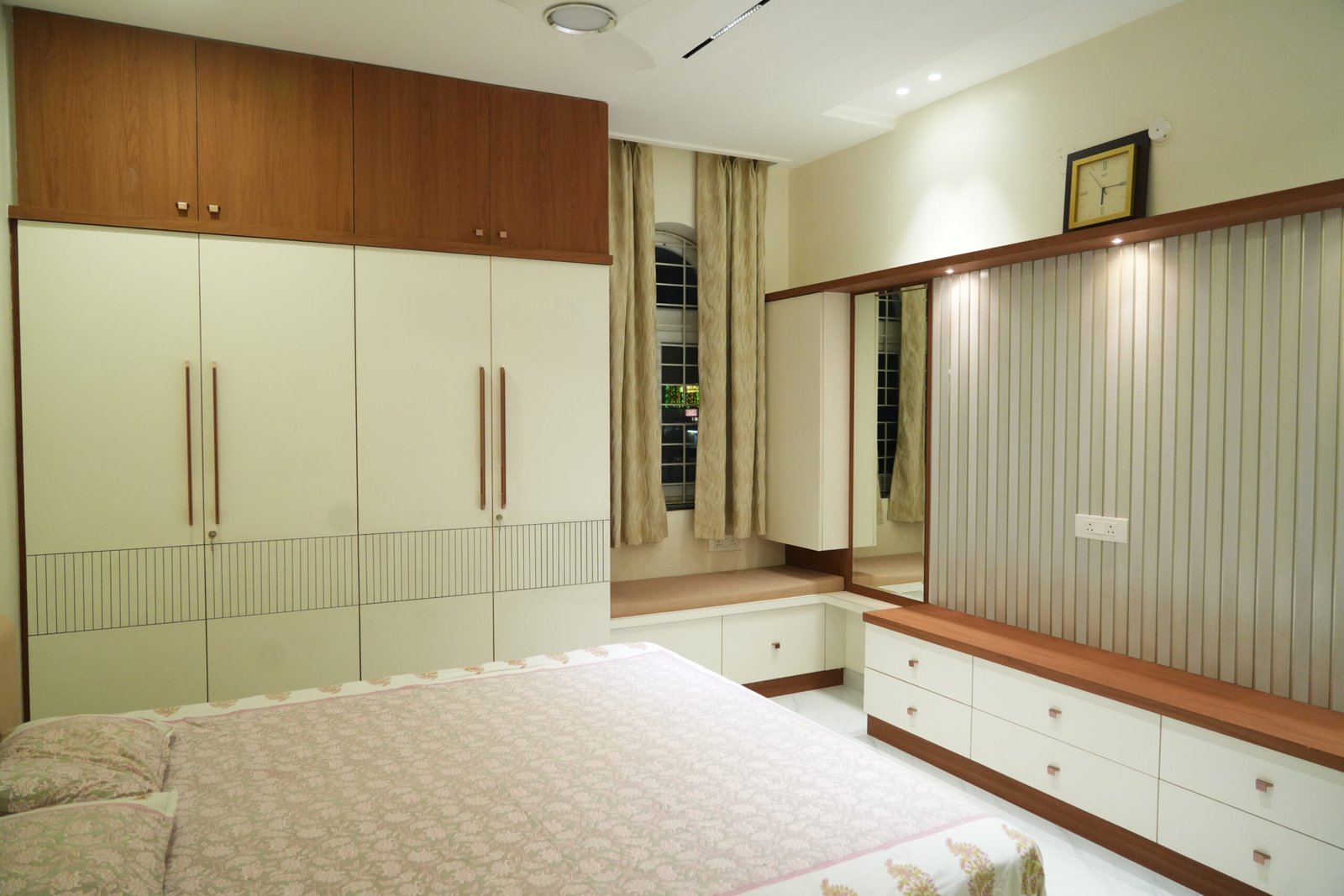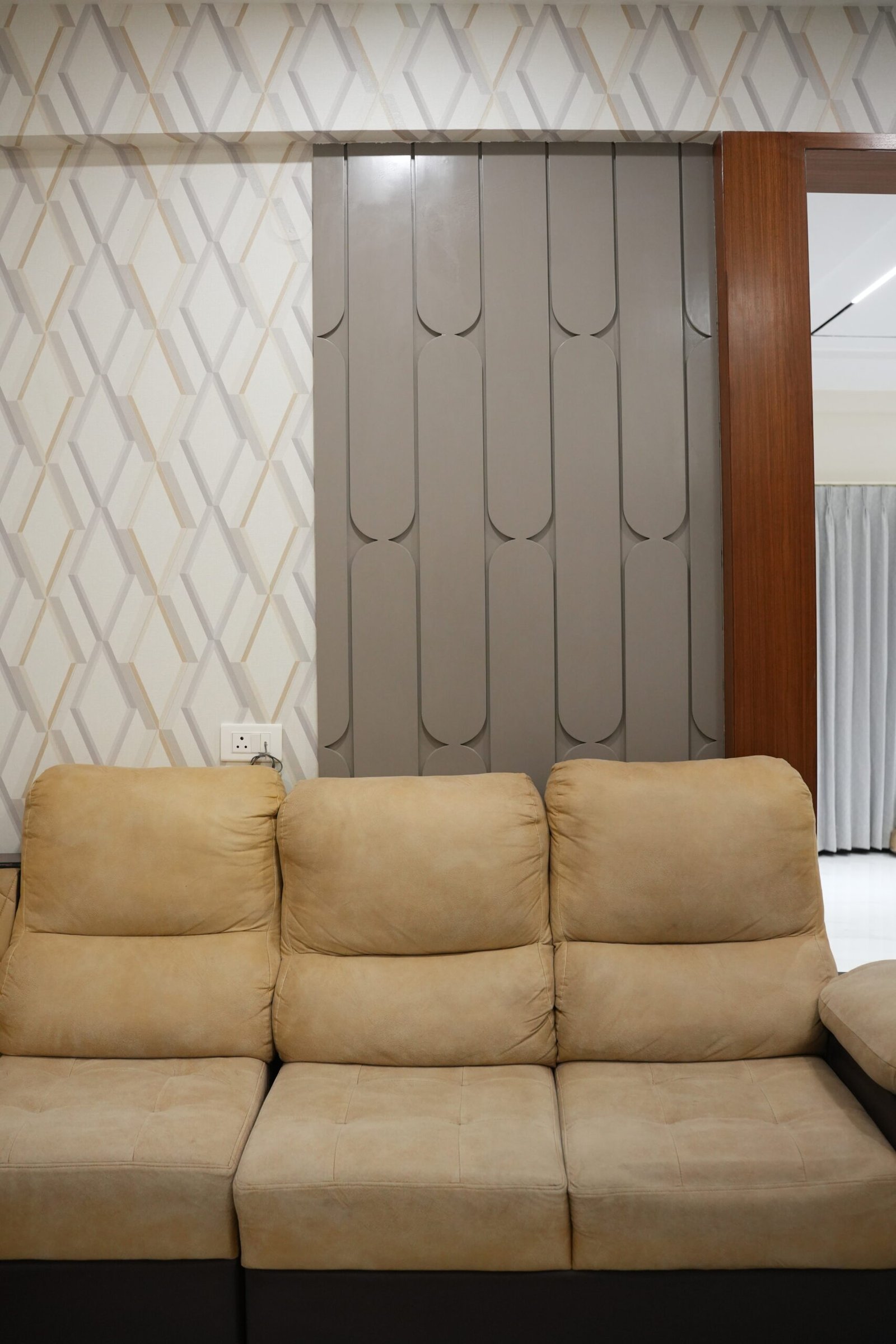 • Geometric lattice accent walls and arched grey wardrobes with full-length mirrors