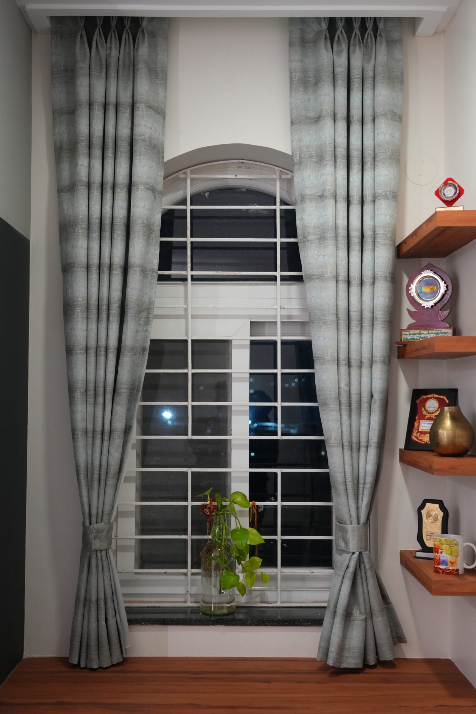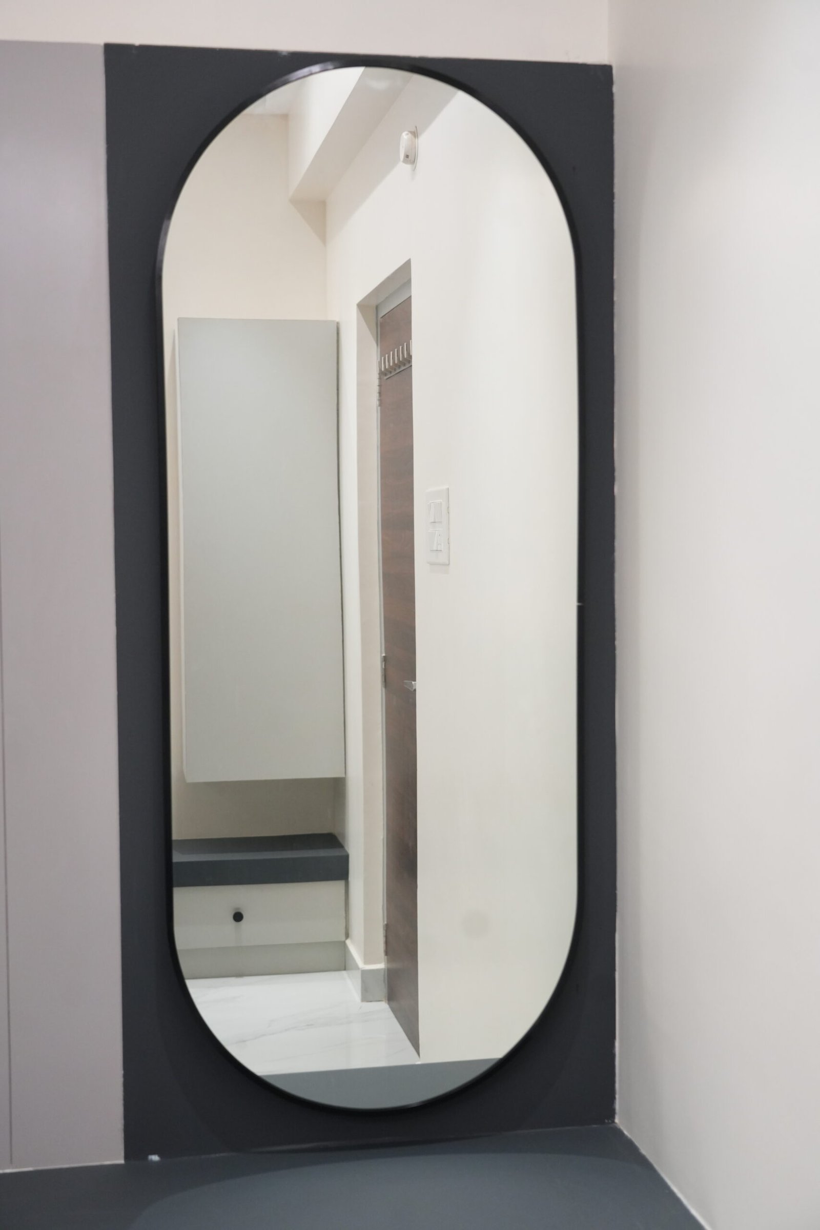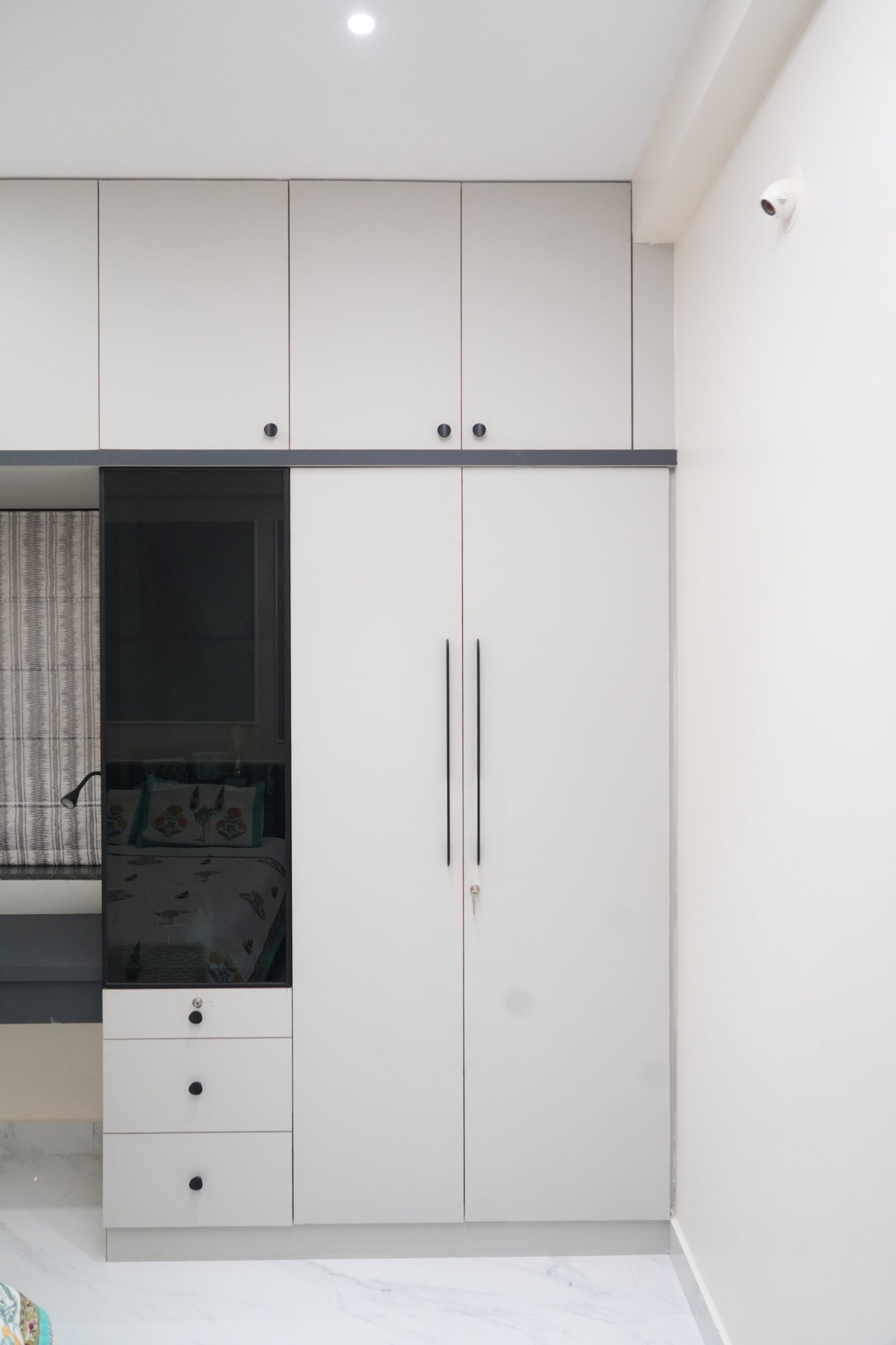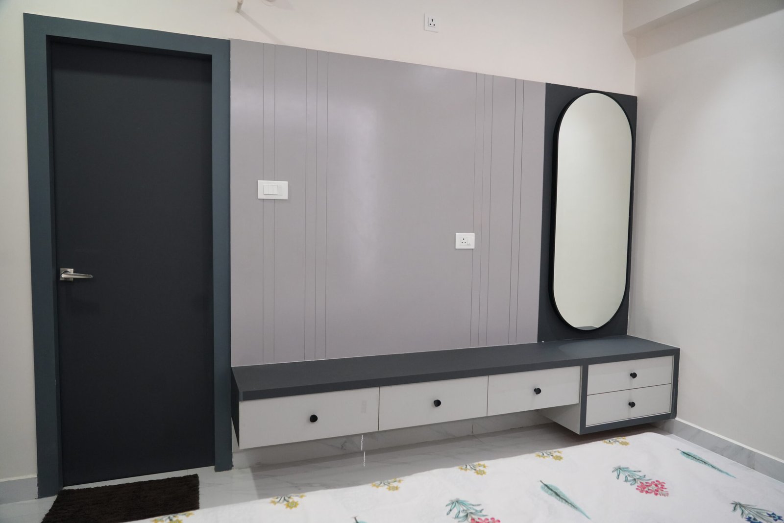 • Geometric lattice accent walls and arched grey wardrobes with full-length mirrors