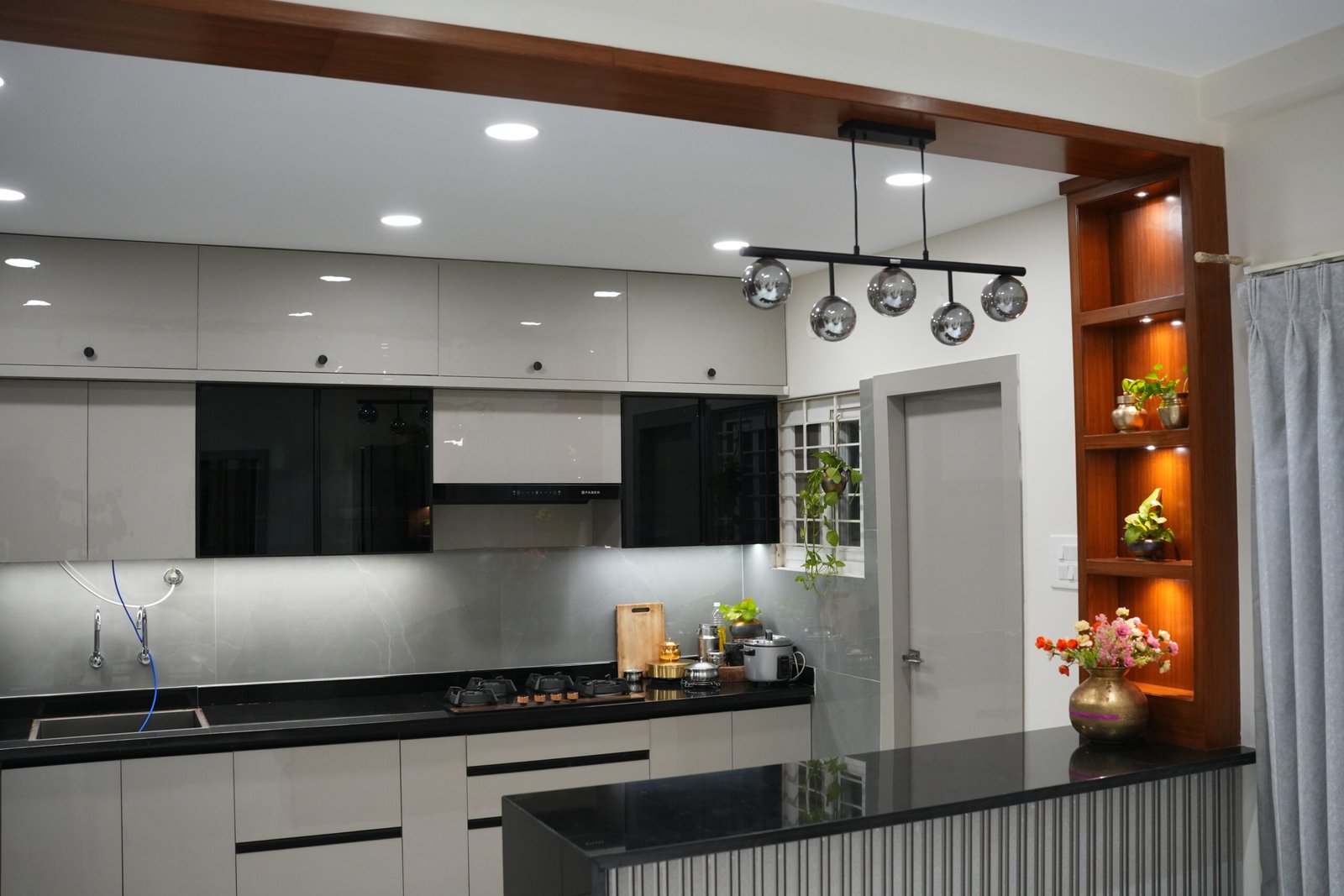 • Sleek kitchen with glossy white cabinets, black granite, and chrome globe pendants