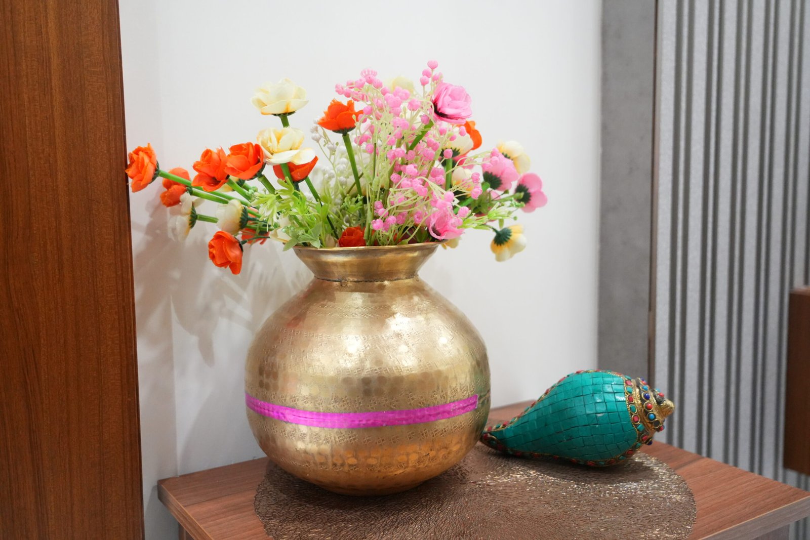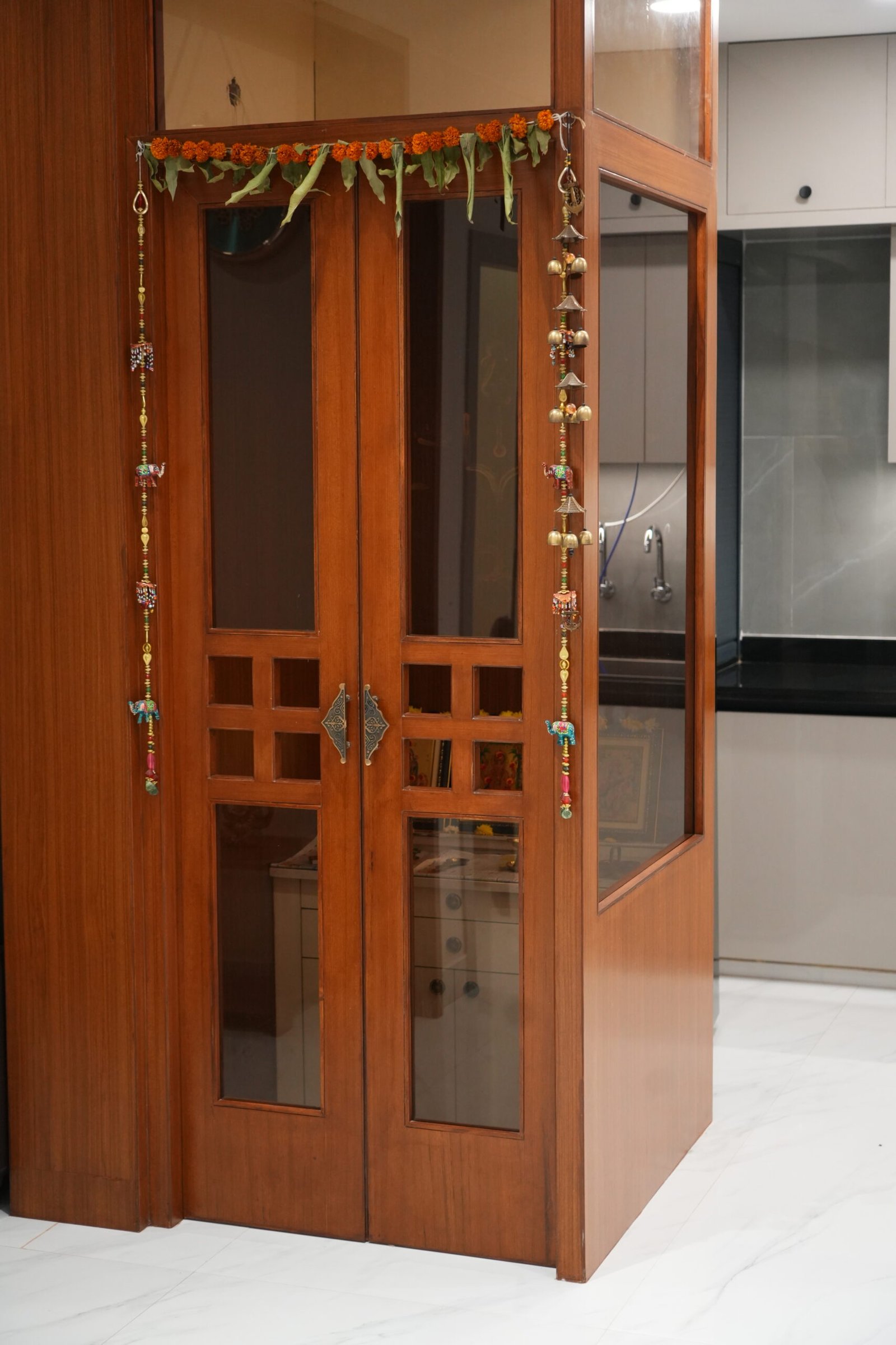 • Traditional teakwood pooja room with glass panels and brass detailing