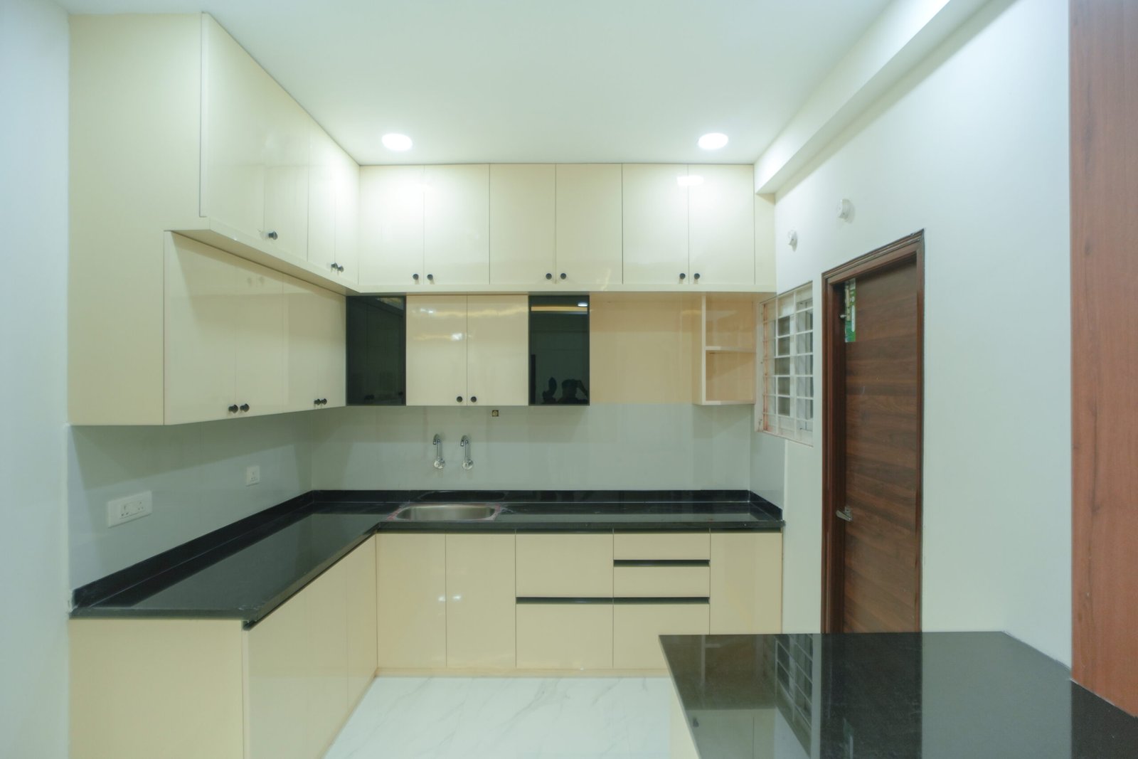 • Spacious L-shaped modular kitchen with cream cabinets and black granite countertops