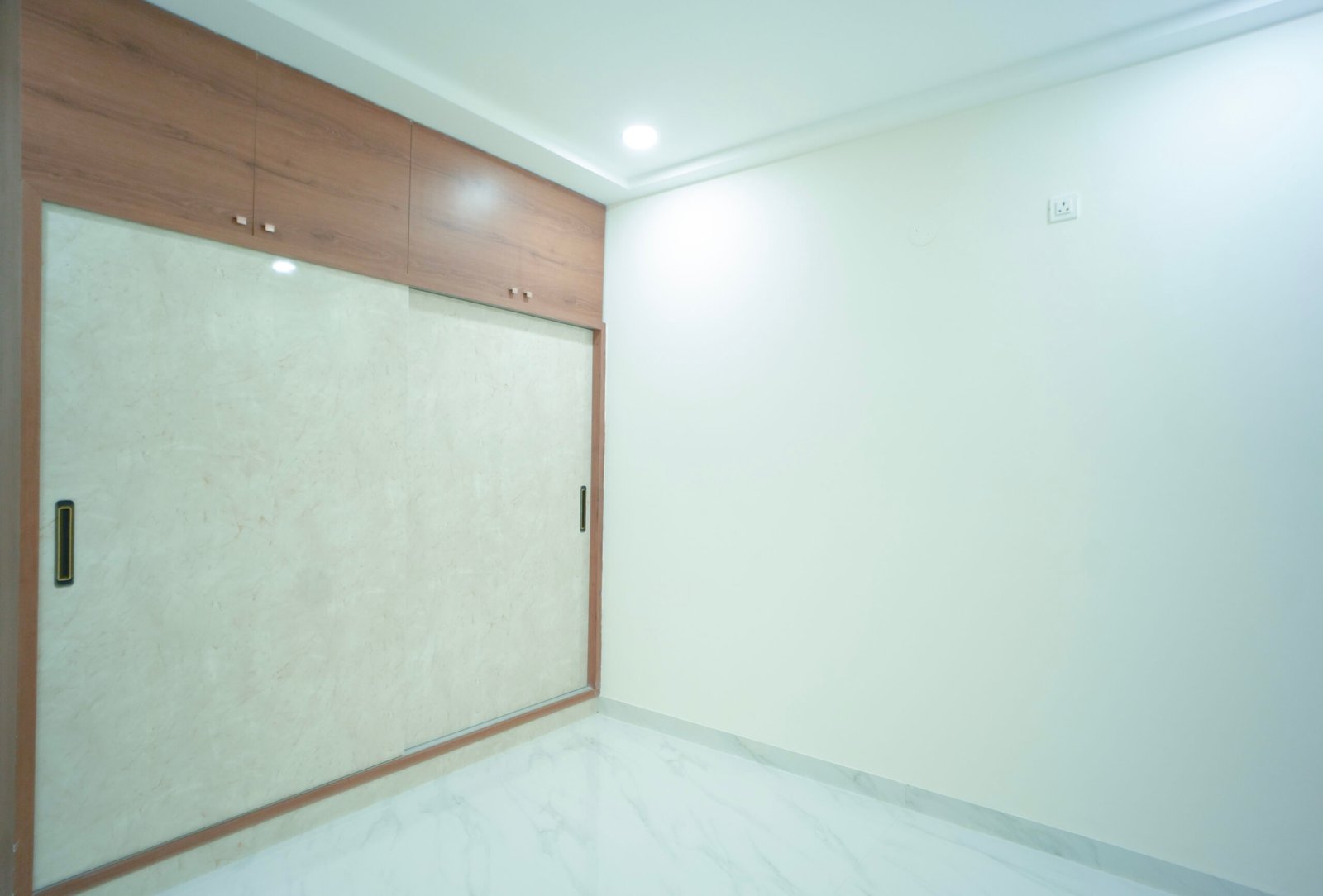 Pradhyumna 402 A thoughtfully designed residence combining soft pastel tones with natural wood accents, creating a calm and organized living environment. Clean lines and strategic storage solutions maximize space while maintaining a light, airy atmosphere.