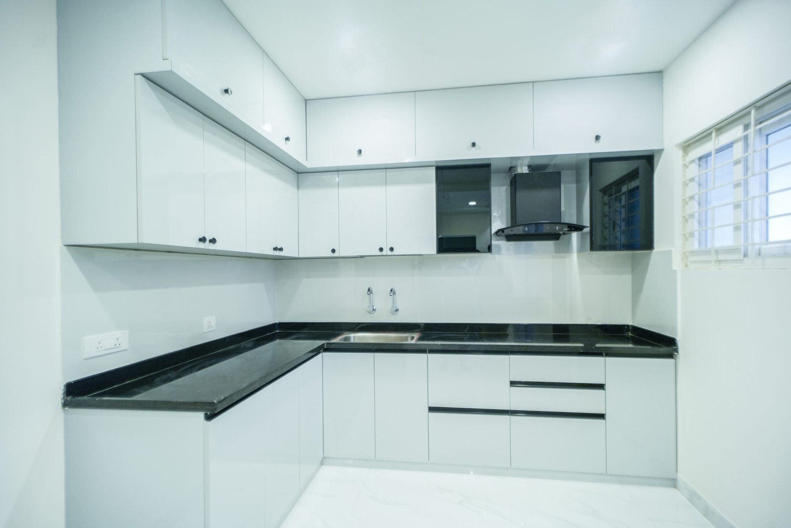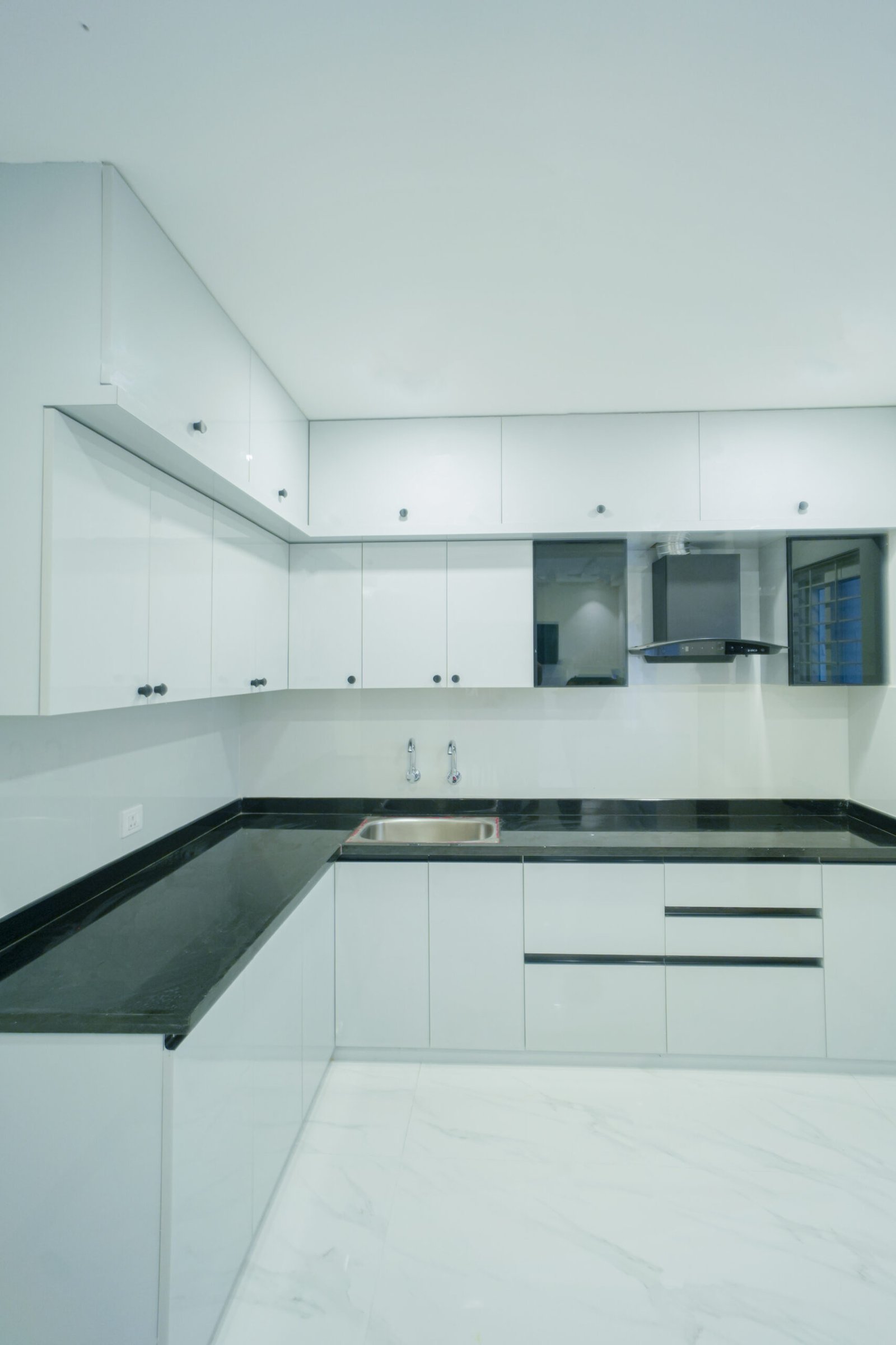- Spacious L-shaped modular kitchen with white cabinets and black granite countertops