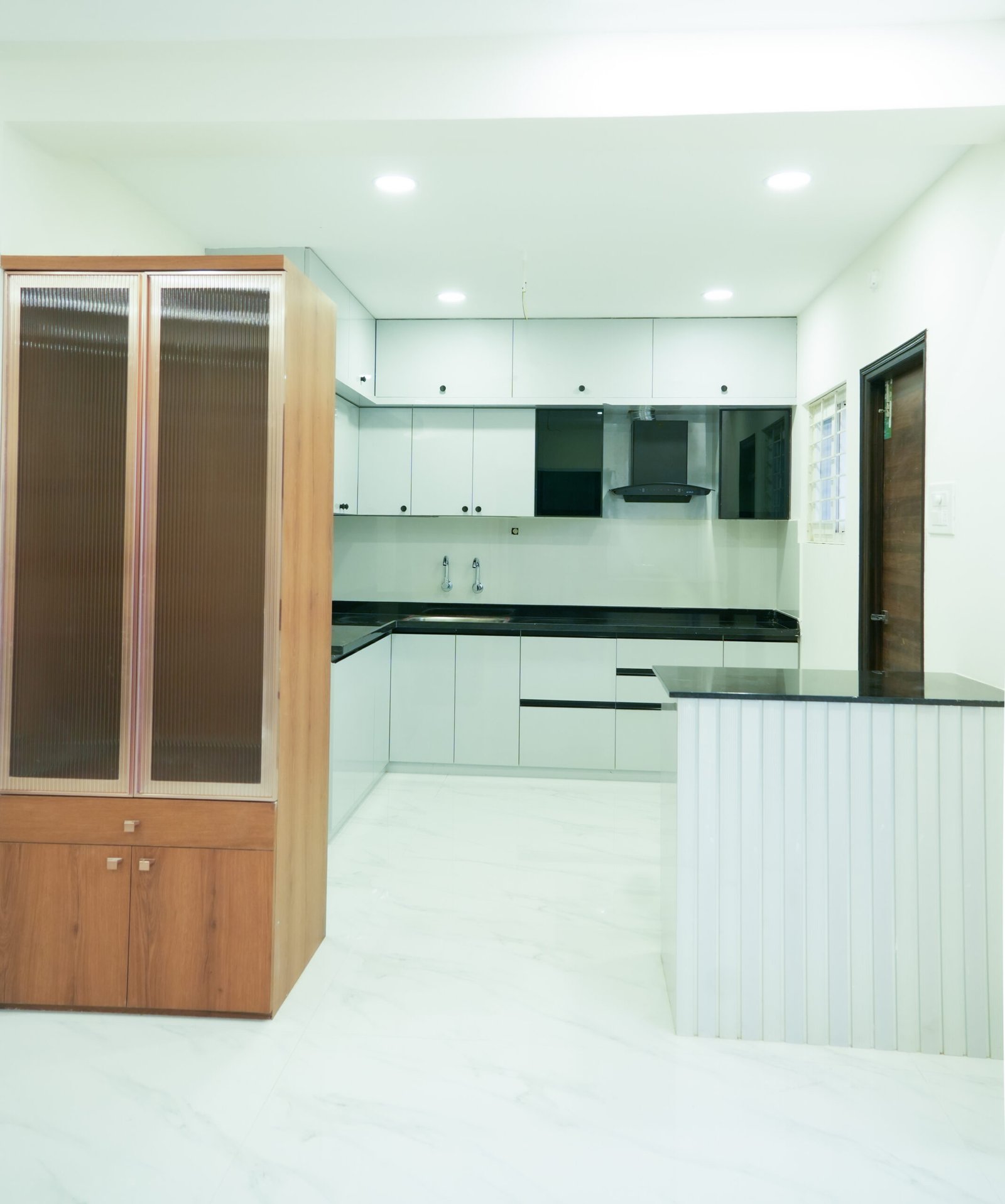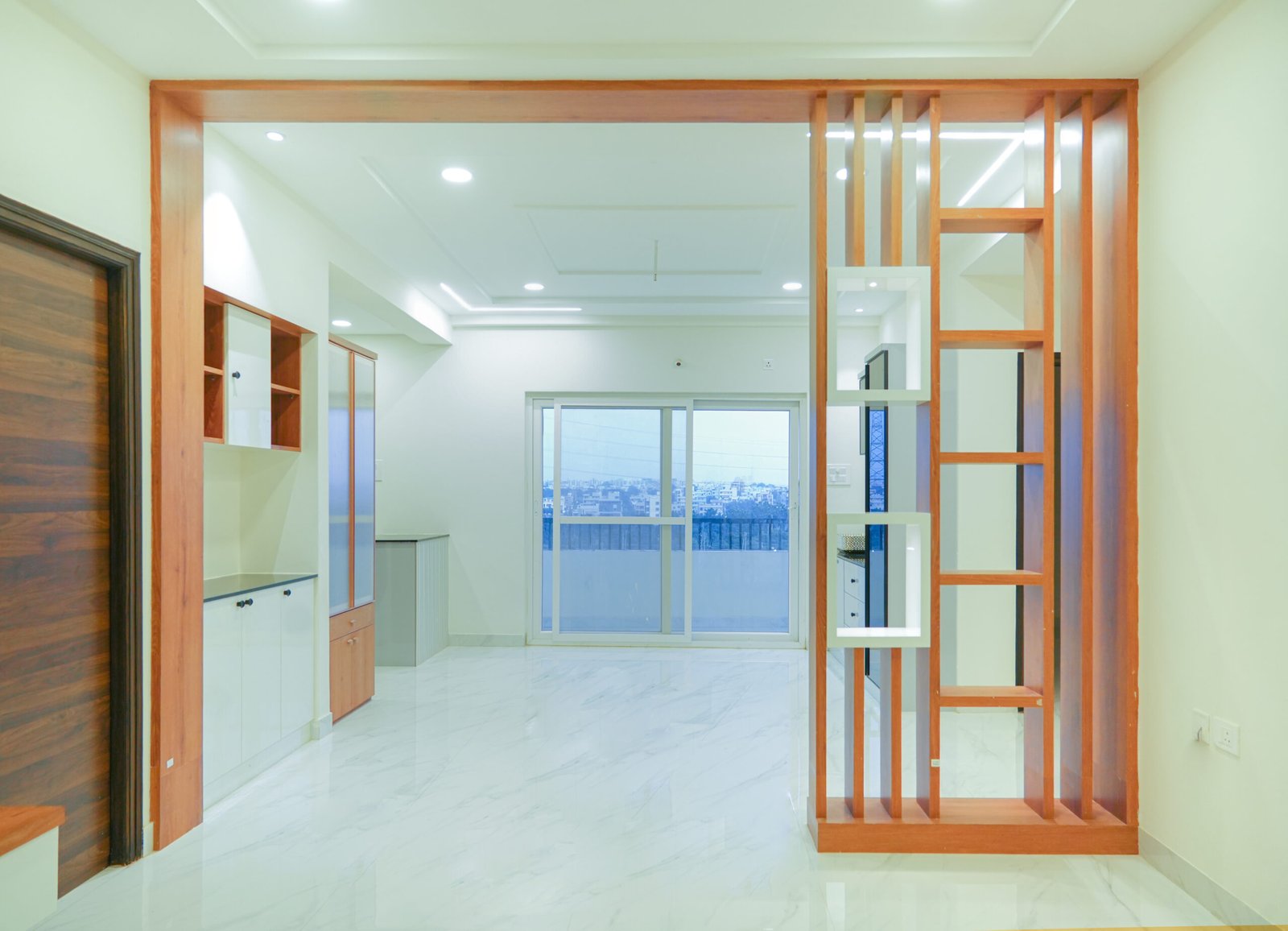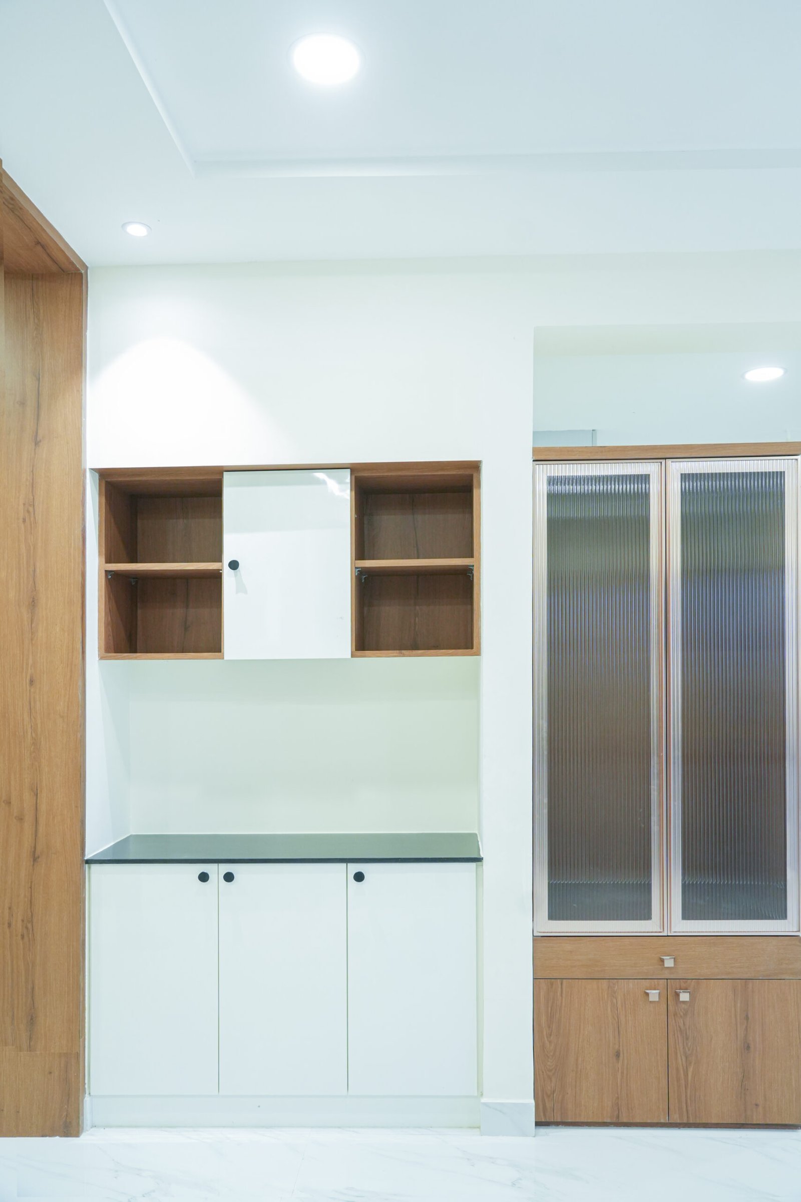 Pradhyumna 403 A bright and airy apartment design maximizing space through clean white finishes and strategic wood accents, creating an organized contemporary living environment.