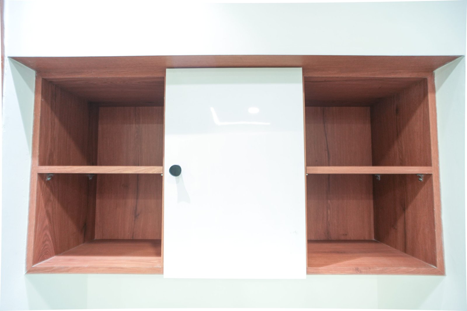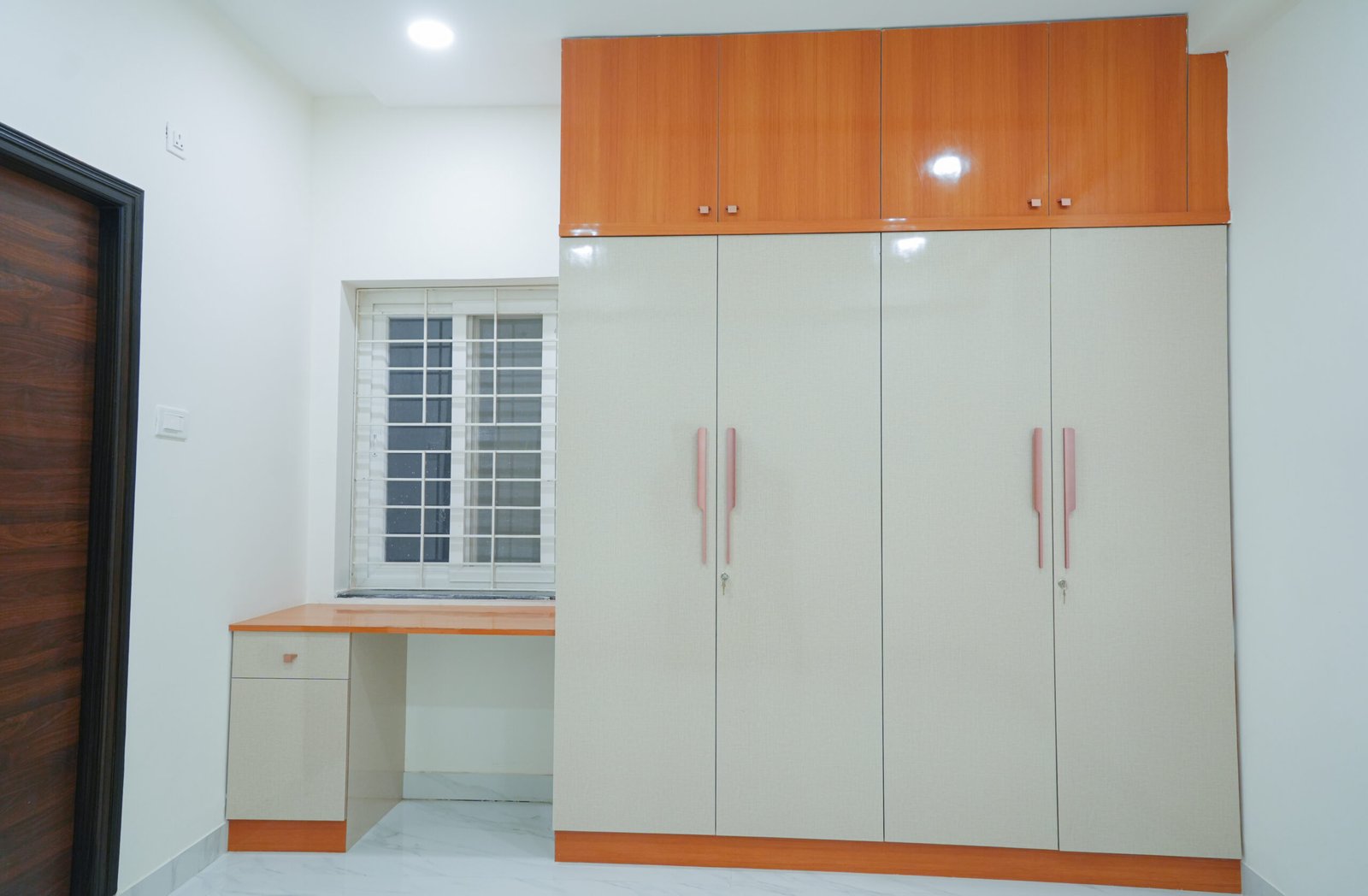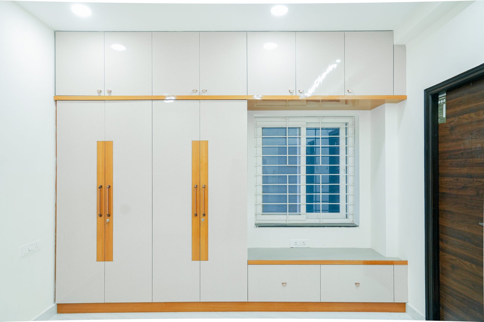 Pradhyumna 403 A bright and airy apartment design maximizing space through clean white finishes and strategic wood accents, creating an organized contemporary living environment.
