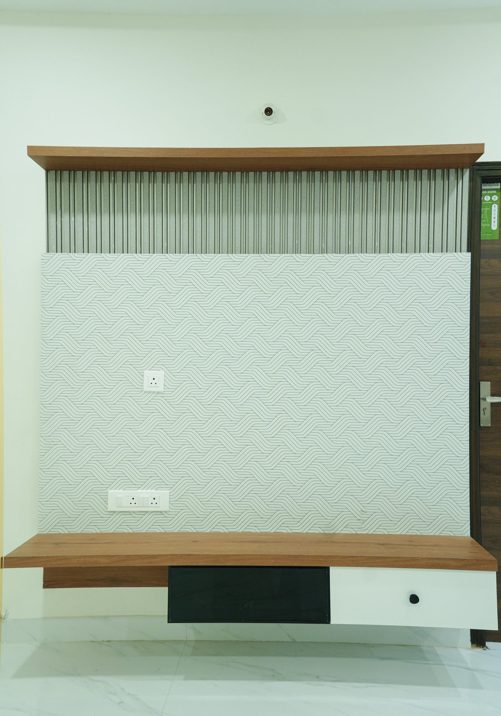 - Custom TV unit with textured geometric panel and vertical wood slat accents